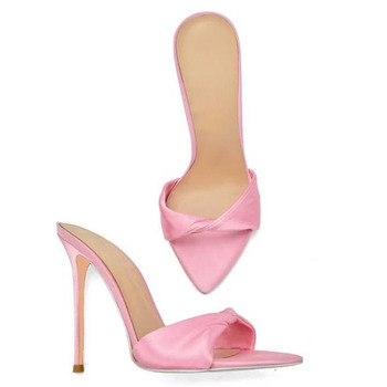 حجم 45 النساء القوس معقود الكعب العالي رقيقة الصنادل الصيف الانزلاق على أحذية مثير اللباس خنجر مفتوحة مدبب اصبع القدم البغال